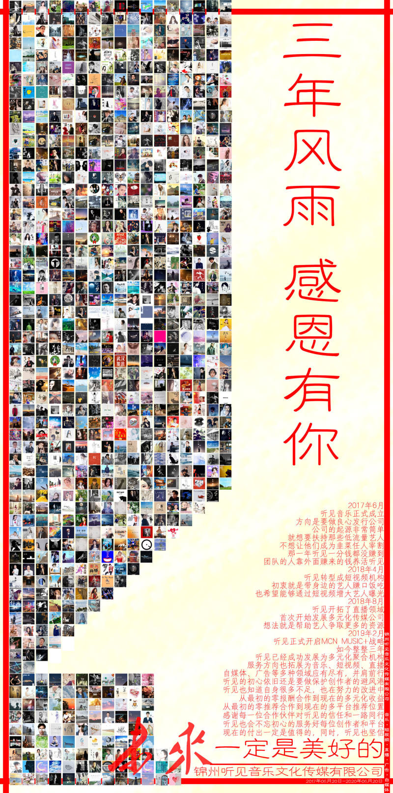 如今整整三年,听见也已经成功发展为多元化聚合机构,服务方向也拓展为音乐、短视频、直播、自媒体、广告等多种领域应有尽有,并肩前行。